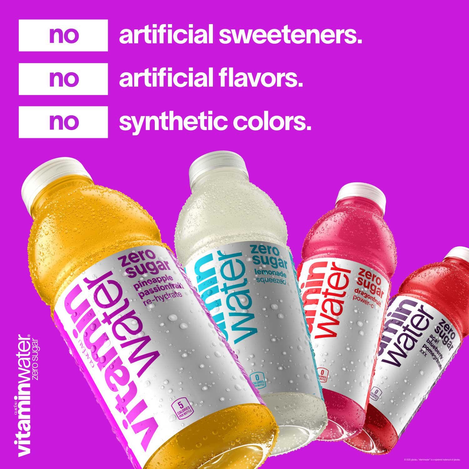 Enjoy the clean and natural taste of Vitaminwater Zero Sugar. The entire lineup contains no artificial sweeteners, flavors, or synthetic colors, making it a great alternative to plain water or overly sweetened drinks. With only 5 calories per 16.9 oz bottle, hydration has never been this guilt-free.
