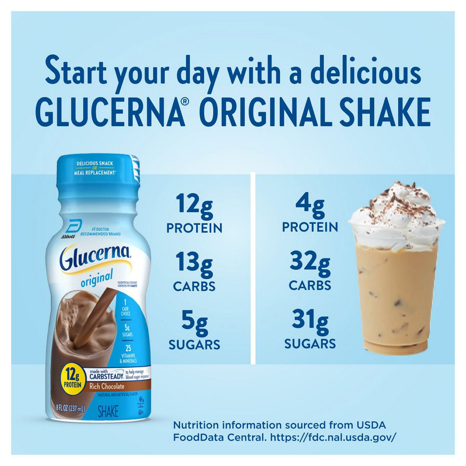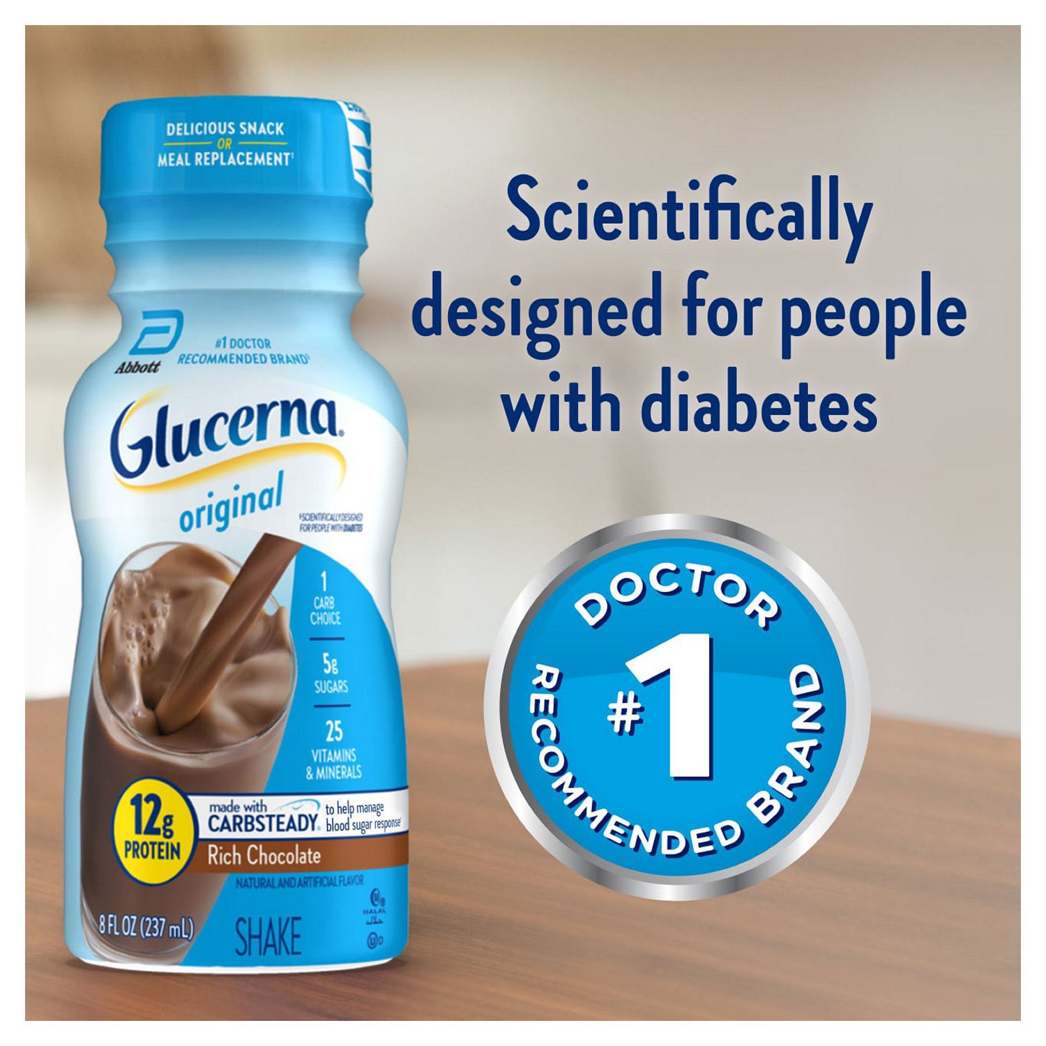 Glucerna shakes are delicious grab-and-go small meal or snack replacements designed for people managing their blood sugar. Glucerna shakes have Carbsteady, unique blends of slow release carbohydrates to help manage blood sugar,* as well as 12 grams of protein, 140 calories, and essential vitamins & minerals. They are suitable for lactose intolerance (not for people with galactosemia) and are gluten-free. Glucerna is the # brand recommended by doctors for people with diabetes.