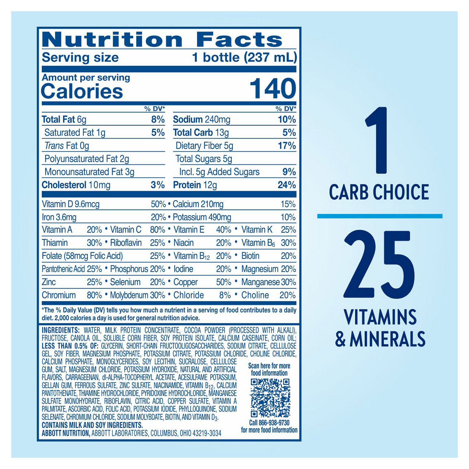 Water, milk protein concentrate, cocoa powder (processed with alkali), fructose, canola oil, soluble corn fiber, soy protein isolate, calcium caseinate, corn oil; Less than 0.5%: glycerin, short-chain fructooligosaccharides, sodium citrate, cellulose gel, soy fiber, magnesium phosphate, ascorbic acid, potassium citrate, potassium chloride, choline chloride, calcium phosphate monoglycerides, soy lecithin, sucralose, cellulose gum, salt, magnesium chloride, potassium hydroxide, natural and artificial flavor, carrageenan, DL-alpha-tocopheryl acetate, acesulfame potassium, gellan gum, ferrous sulfate, zince sulfate, niacinamide, vitmain b12, calcium pantothenate, thiamine hydrochloride, pyridoxine hydrochloride, manganese sulfate monohydrate, riboflavin, citric acid, copper sulfate, vitamin A palmitate, folic acid, potassium iodide, phylloquinone, sodium selenate, chromium chloride, sodium molybdate, biotin, and vitamin D3. Contains Milk and soy ingredients.