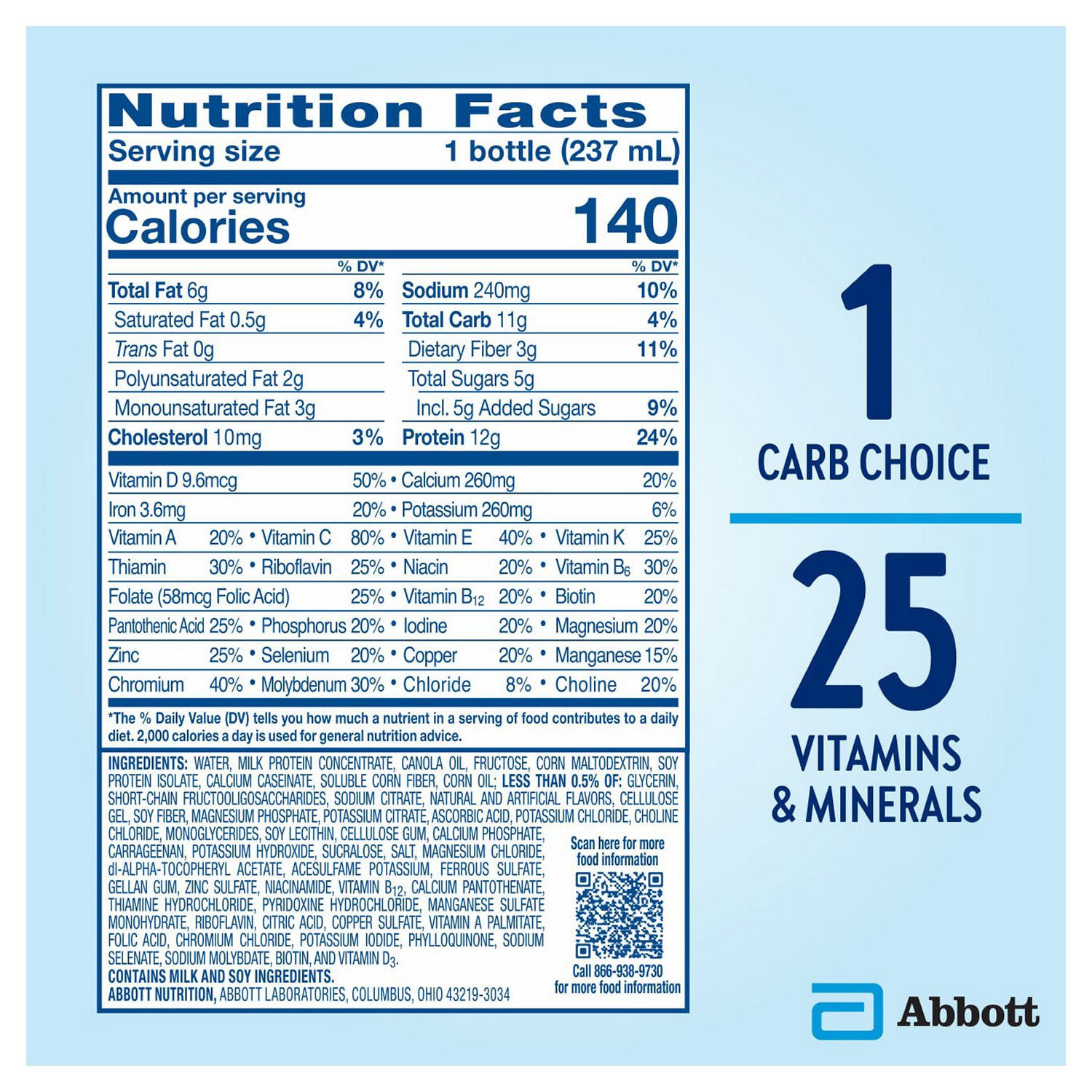 Water, milk protein concentrate, canola oil, fructose, corn maltodextrin, soy protein isolate, calcium caseinate, soluble corn fiber, corn oil; Less than 0.5%: glycerin, short-chain fructooligosaccharides, sodium citrate, natural and artificial flavors, cellulose gel, soy fiber, magnesium phosphate, potassium citrate, ascorbic acid, potassium chloride, choline chloride, monoglycerides, soy lecithin, cellulose gum, calcium phosphate, carrageenan, potassium hydroxide, sucralose, salt, magnesium chloride, DL-alpha-tocopheryl acetate, acesulfame potassium, ferrous sulfate, gellan gum, zince sulfate, niacinamide, vitmain b12, calcium pantothenate, thiamine hydrochloride, pyridoxine hydrochloride, manganese sulfate monohydrate, riboflavin, citric acid, copper sulfate, vitamin A palmitate, folic acid, chromium chloride, potassium iodide, phylloquinone, sodium selenate, sodium molybdate, biotin, and vitamin D3. Contains Milk and soy ingredients.