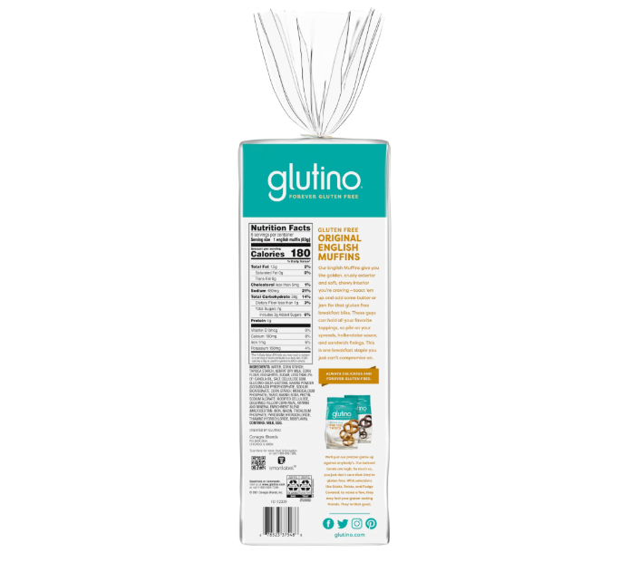 Build yourself a better breakfast with Glutino Gluten Free Original English Muffins. Made with no wheat ingredients and gluten free certified, these delicious Glutino English muffins have a golden, crusty exterior and a soft and chewy interior to give you the texture and taste you love without all the gluten you don't. These gluten free English muffins make for a perfect gluten free breakfast option or snack to top with butter, jam, honey and more. With six satisfying gluten free muffins in each box and easy toaster oven preparation, this is one breakfast staple you just can't compromise on. Glutino: Forever Gluten Free.