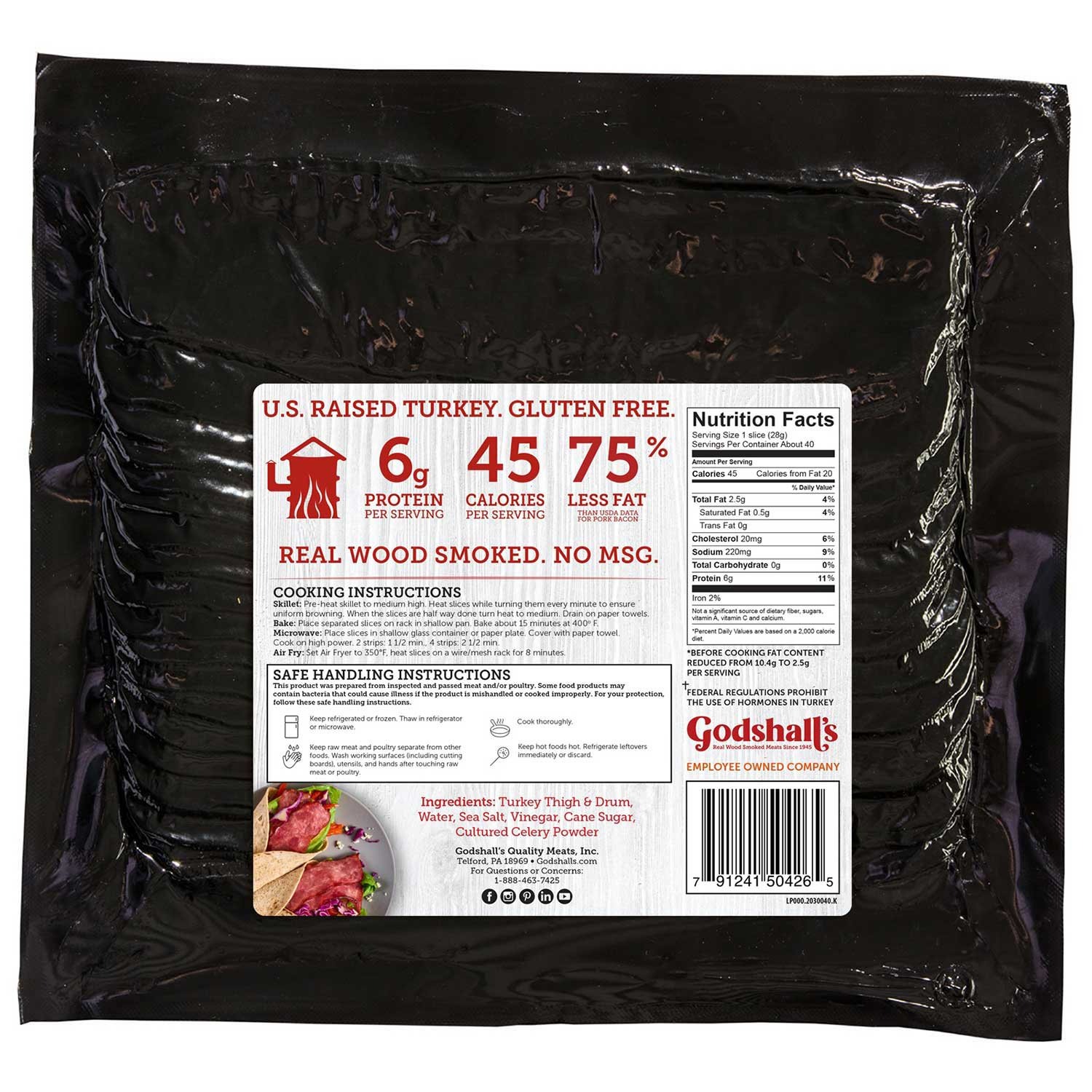 Godshall's bacon is smoked in a real smokehouse like traditional bacon, and because it is made from real turkey, it maintains its size as it cooks. You get to enjoy more flavor with less fat when you make the switch to this all-natural alternative.