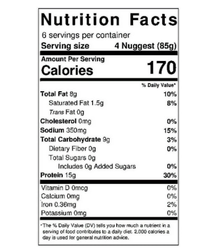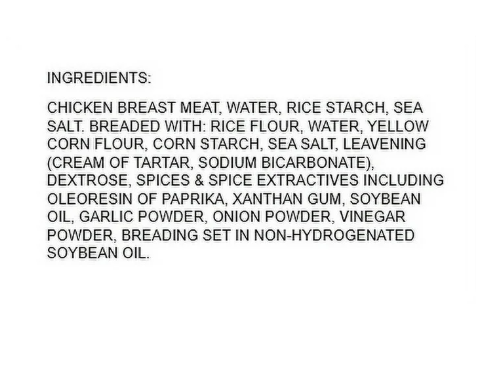 Chicken Breast Meat, Water, Rice Starch, Sea Salt, Breaded With Rice Flour, Water, Yellow Corn Flour, Corn Starch, Sea Salt, Leavening (Cream of Tartar, Sodium Bicarbonate), Dextrose, Spices & Spice Extractives Including Oleoresin of Paprika, Xanthan Gum, Soybean Oil, Garlic Powder, Onion Powder, Vinegar Powder, Breading Set In Non-Hydrogenated Soybean Oil.