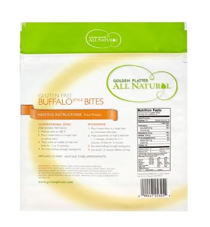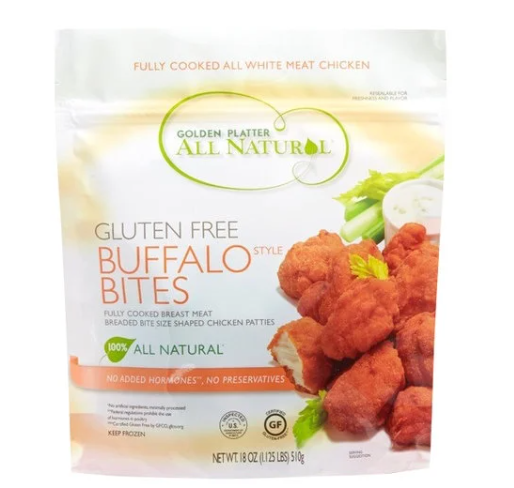 Golden Platter All Natural Gluten Free Buffalo Style Bites, 18 oz. Fully cooked chicken wings. Resealable for freshness and flavor. Fully cooked buffalo style breaded chicken wing sections. 100% natural (No Artificial ingredients, minimally processed). No added hormones (Federal regulations prohibit the use of hormones in poultry), No preservatives. Inspected for wholesomeness by US Department of Agriculture. GF: Certified gluten free (Certified gluten free by GFCO, gfco.org).