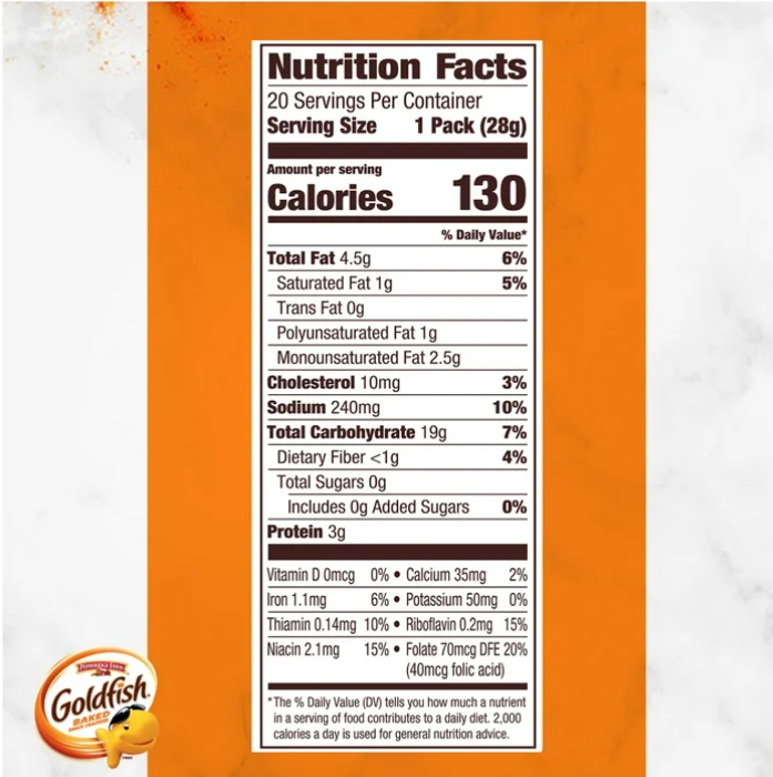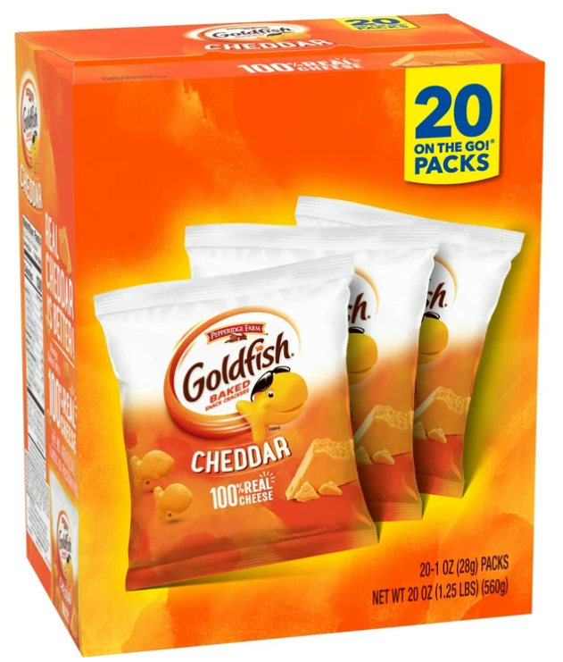 - ON-THE-GO SNACK PACKS: This box contains 20 individually portioned, 1-ounce Goldfish snack packs, each with a single serving of roughly 50 crackers
