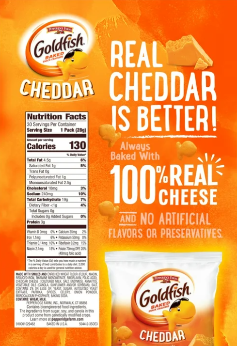- BAKED WITH REAL CHEESE: Our Goldfish Cheddar snack crackers are a crunchable, munchable snack-time favorite, always baked with 100% real Cheddar cheese