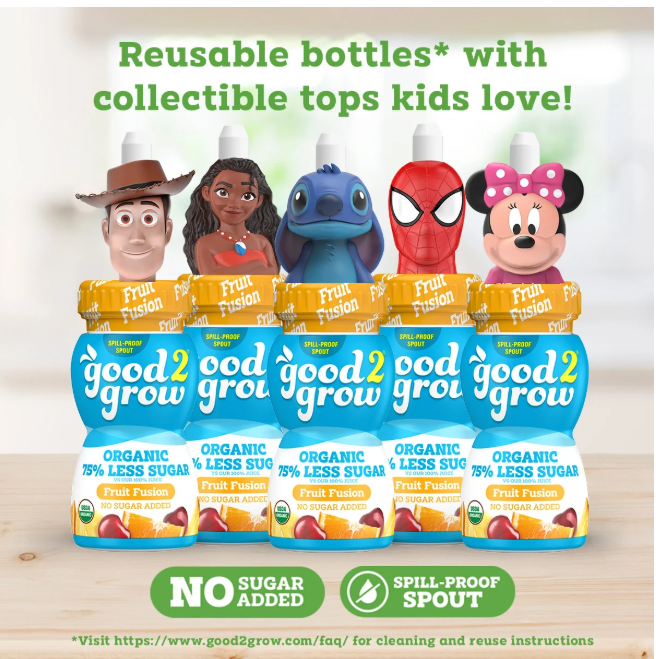 good2grow’s 6oz Organic Low Sugar Fruit Fusion juice is Organic Certified and has 75% less sugar than our 100% juice. good2grow offers hundreds of collectable character tops that come with a spill proof valve to prevent leaks. The Organic Low Sugar juice has no sugar added and only has 15 calories and 3g of sugar.