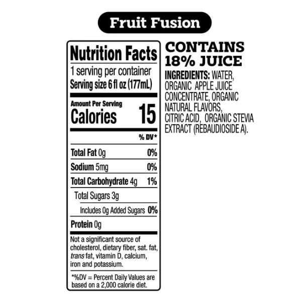 Water, Organic Apple Juice Concentrate, Organic Natural Flavors, Citric Acid, Organic Stevia Extract (Rebaudioside a).