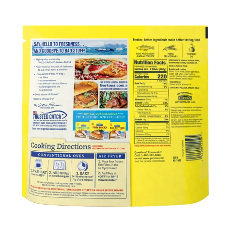 Alaskan Pollock Fillets Breadcrumb Coating: Wheat Flour, Water, Yellow Corn Flour, Sugar, Salt, Whey, Yeast, Baking Powder (Baking Soda, Cream of Tartar), Onion Powder, Natural Flavor. Vegetable Oil: Canola and/or Soybean Oil.