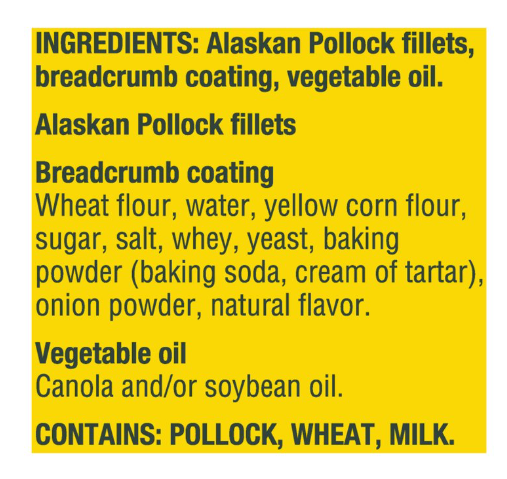 Pollock Fillets, Breadcrumb Coating, Canola Oil. Pollock Fillets: Pollock, Sodium Tripolyphosphate (to Retain Fish Moisture). Breadcrumb Coating: Wheat Flour, Water, Yellow Corn Flour, Sugar, Salt, Whey, Yeast, Baking Powder (Baking Soda, Sodium Aluminum Phosphate), Onion Powder, Cream of Tartar, Natural Flavor. Canola Oil.
