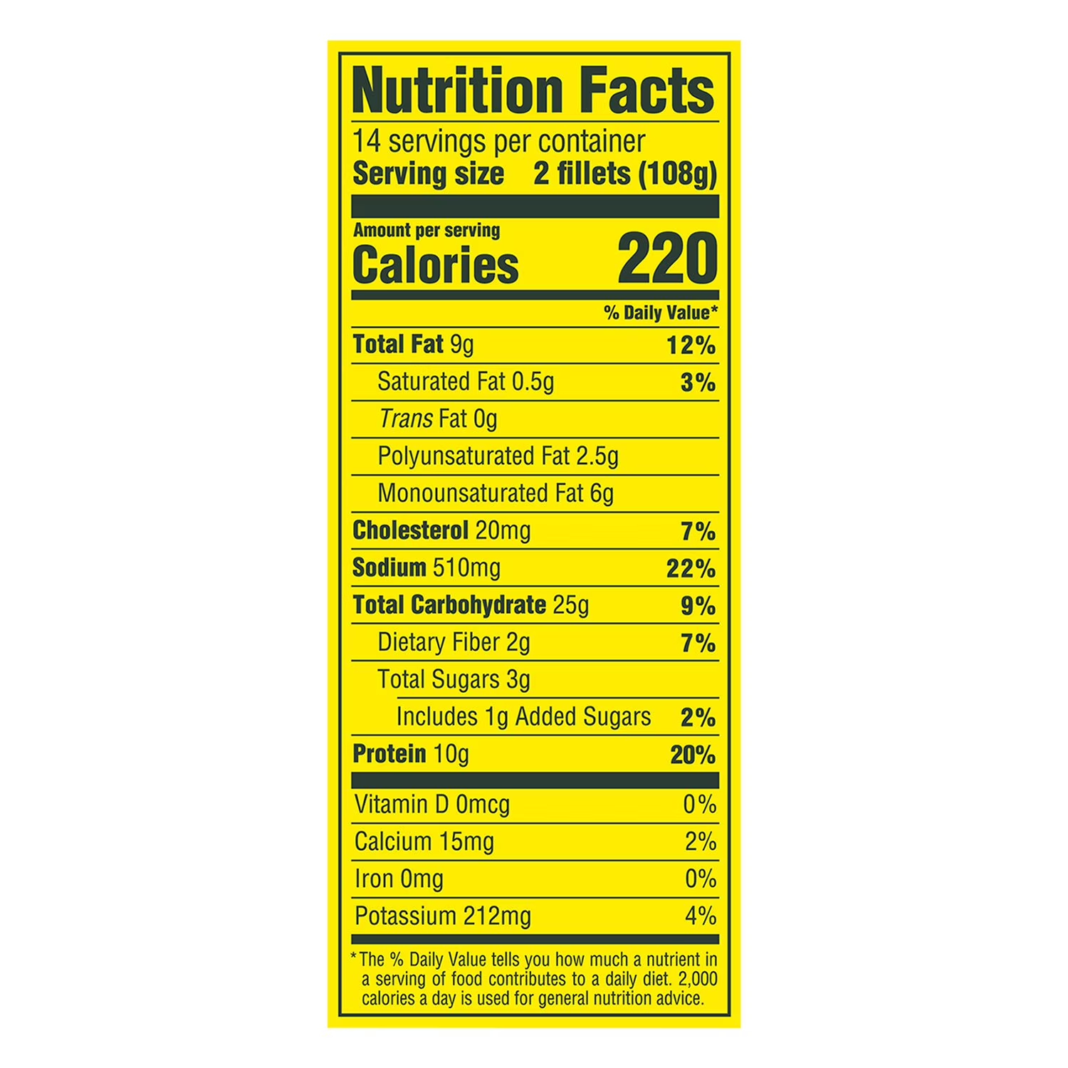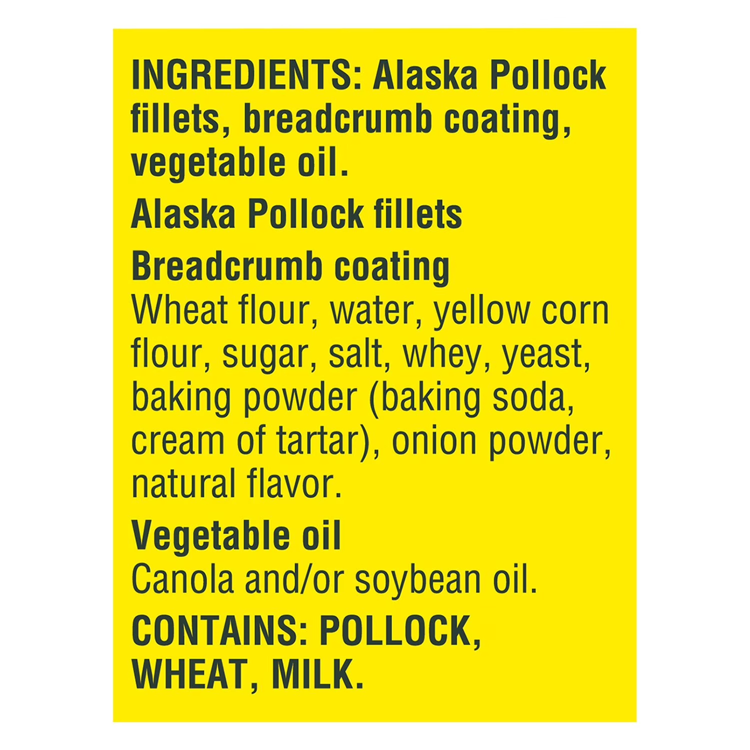 Ingredients: Alaska Pollock Fillets, Breadcrumb Coating (Wheat Flour, Water, Yellow Corn Flour, Sugar, Salt, Whey, Yeast, Baking Powder (Baking Soda, Cream Of Tartar), Onion Powder, Natural Flavor), Vegetable Oil (Canola And/or Soybean Oil).