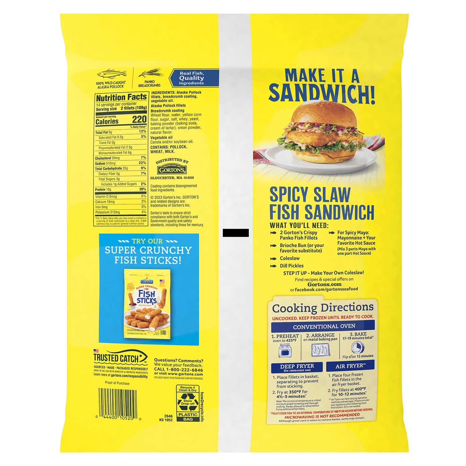 Bring home a delicious taste of seafood with our Gorton's Golden Crispy Panko Fish Fillets, Frozen, 28 ct.. Made from high-quality, wild-caught Alaskan Pollock, our breaded fillets are ideal for serving up a fresh-tasting, convenient meal with 10g of protein per serving. To lock in our fish’s full flavor and nutrition, we ensure this product is flash-frozen at the peak of freshness. These fillets are also coated with panko breadcrumbs made from daily baked bread for a satisfying crunch. These fillets are always prepared with no artificial colors or flavors, hydrogenated oils, or antibiotics. Plus, our fish is a natural source of natural Omega-3s and protein.