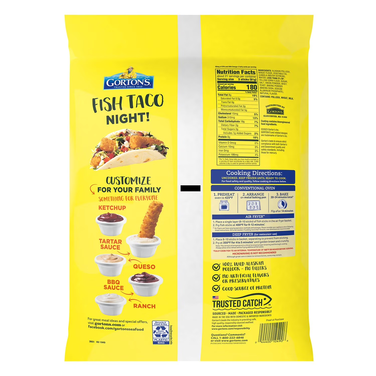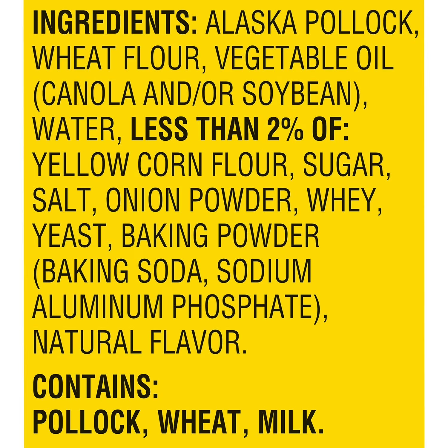 Ingredients: Alaskan Pollock, Wheat Flour, Vegetable Oil (Canola And/or Soybean), Water, Less Than 2% Of: Yellow Corn Flour, Sugar, Salt, Onion Powder, Whey, Yeast, Baking Powder (Baking Soda, Sodium Aluminum Phosphate), Natural Flavor.