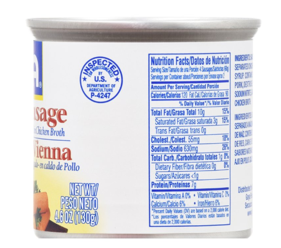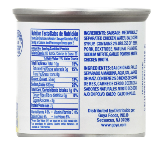 GOYA Vienna Sausage With Chicken Beef & Pork In Broth 4.6 oz. Goya Vienna Sausage is made with chicken, beef, and pork with chicken broth added in to enhance the flavor. It is inspected for wholesomeness by the USDA to maintain high-quality standards. Goya Sausage is available in a 4.6 oz can containing six sausages. They are perfectly portioned for one person to enjoy or to share as a light snack with a friend.