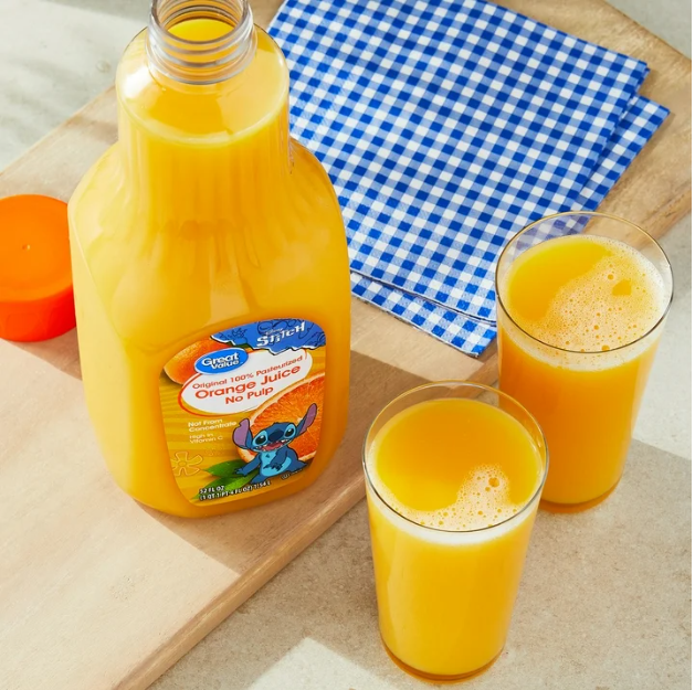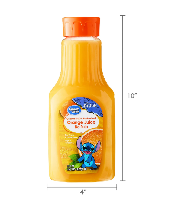 Great Value 100% Pasteurized Orange Juice with No Pulp, Featuring Stitch, 52 fl oz