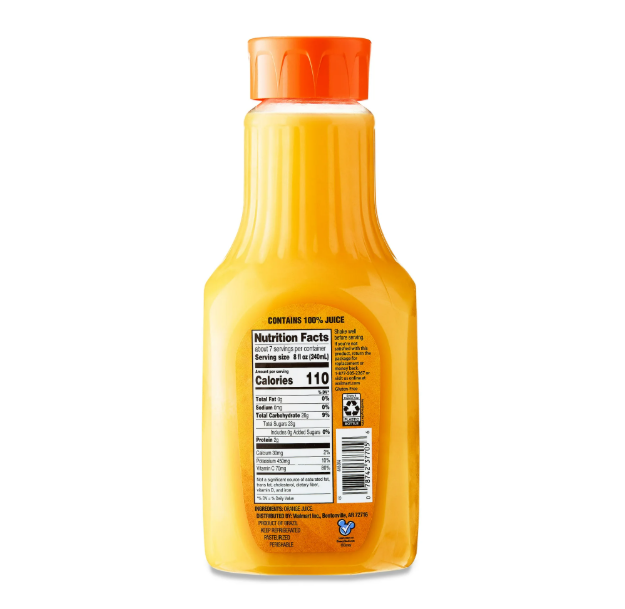 The flavors of the grove await you with Great Value 100% Pasteurized Orange Juice with No Pulp. Not from concentrate, this refreshing orange juice is high in vitamin C and has no added sugars. The only ingredients is 100% orange juice, and there are about seven servings per bottle. Start each day with a glass of Great Value 100% Pasteurized Orange Juice with No Pulp.