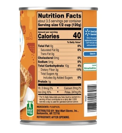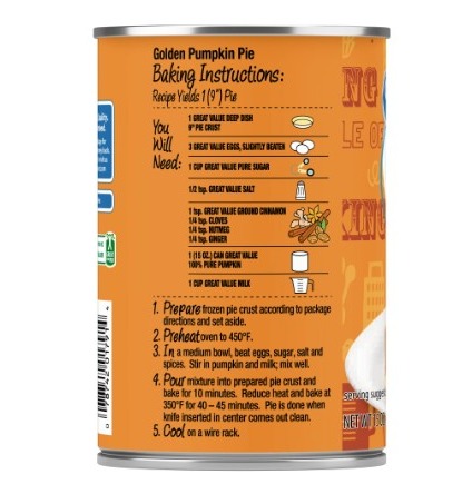 Bake the perfect pumpkin pies with Great Value 100% Pure Pumpkin. This canned pumpkin with no added sugar has a creamy texture, classic orange color, and pure pumpkin taste. This pure pumpkin is perfect for adding to those pumpkin-flavored specialties on your menu. Make traditional pumpkin pie or include this pure pumpkin to make pumpkin waffles, pancakes, cheesecakes, muffins, and breads. You can even try making a warm, creamy pumpkin soup or add additional flavor to some homemade chili. Add the perfect pumpkin flavor to your seasonal menu with Great Value 100% Pure Pumpkin.