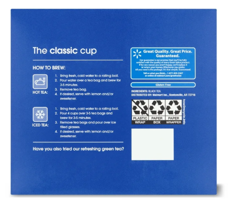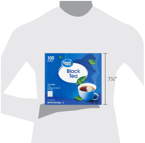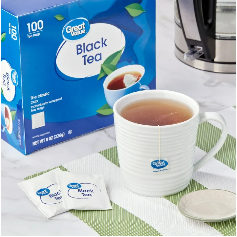 Enjoy the soothing aroma and vibrant flavor of Great Value Black Tea Bags. Steep in hot water and serve with lemon for a classic and satisfying combination that you can enjoy morning, noon, or night. Try this black tea over ice or use it to create sun tea during warmer times of the year when you need a refreshing, sugar-free drink. Each container of Great Value Black Tea Bags comes with 100 bags, so you can stay well-stocked both at home and at the office.