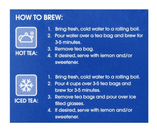 Hot Tea Instructions: **1. Bring fresh cold water to a rolling boil. **2. Pour water over a tea bag and brew for 3 to 5 minutes. **3. Remove tea bag. **If desired, serve with lemon and/or sweetener. **Iced Tea Instructions: **1. Bring fresh cold water to a rolling boil. **2. Pour 4 cups over 3 to 5 tea bags and brew for 3 to 5 minutes. **3. Remove tea bags and pour over ice filled glasses. **If desired, serve with lemon and/or sweetener.