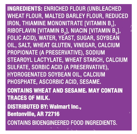ENRICHED FLOUR (UNBLEACHED WHEAT FLOUR, MALTED BARLEY FLOUR, REDUCED IRON, THIAMINE MONONITRATE [VITAMIN B1], RIBOFLAVIN [VITAMIN B2], NIACIN [VITAMIN B3], FOLIC ACID), WATER, YEAST, SUGAR, SOYBEAN OIL, SALT, WHEAT GLUTEN, VINEGAR, CALCIUM PROPIONATE (A PRESERVATIVE), SODIUM STEAROYL LACTYLATE, WHEAT STARCH, CALCIUM SULFATE, SORBIC ACID (A PRESERVATIVE), HYDROGENATED SOYBEAN OIL, CALCIUM PHOSPHATE, ASCORBIC ACID, SESAME. CONTAINS WHEAT AND SESAME. MAY CONTAIN TRACES OF MILK.