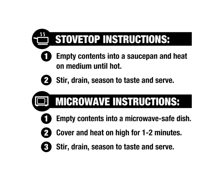 Stovetop - From Ambient **Stovetop Instructions: **1. Empty contents into saucepan and heat on medium-high for approximately 5 minutes. **2. Stir, drain, season to taste and serve. **Microwave - From Ambient **1. Empty contents into microwave-safe dish. **2. Cover and heat on high for 3-4 minutes. **3. Stir, drain, season to taste and serve.