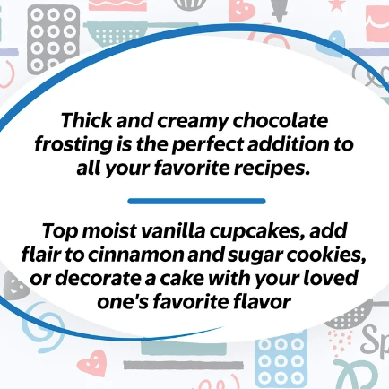 Transform your dessert into a decadent treat with a few spoonful's of Great Value Chocolate Frosting. This thick and creamy chocolate frosting is the perfect addition to all your favorite recipes. Top moist vanilla cupcakes, add flair to cinnamon and sugar cookies, or decorate a cake with your loved one's favorite flavor. With 14 servings per tub, you'll have enough for all of your culinary confections. No chocoholic should be without a tub of Great Value Chocolate Frosting.