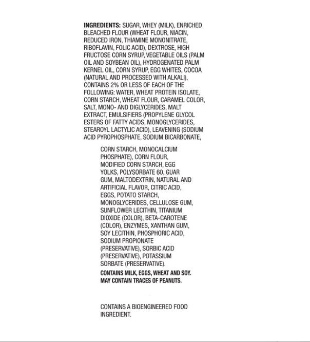 Sugar, Whey (Milk), Enriched Bleached Flour (Wheat Flour, Niacin, Reduced Iron, Thiamine Mononitrate, Riboflavin, Folic Acid), Dextrose, High Fructose Corn Syrup, Vegetable Oils (Palm Oil, Soybean Oil), Hydrogenated Palm Kernel Oil, Corn Syrup, Egg Whites, Cocoa (Natural and processed with Alkali), Contains 2% or less of each of the following: Water, Wheat Protein Isolate, Cornstarch, Wheat Flour, Caramel Color, Salt, Mono- and Diglycerides, Malt Extract, Emulsifiers (Propylene Glycol Esters of Fatty Acids, Monoglycerides, Stearoyl Lactylic Acid), Leavening (Sodium Acid Pyrophosphate, Sodium Bicarbonate, Cornstarch, Monocalcium Phosphate), Corn Flour, Modified Cornstarch, Egg Yolks, Polysorbate 60, Guar Gum, Maltodextrin, Natural and Artificial Flavor, Citric Acid, Eggs, Potato Starch, Monoglycerides, Cellulose Gum, Sunflower Lecithin, Titanium Dioxide (Color), Beta Carotene (Color), Enzymes, Xanthan Gum, Soy Lecithin, Phosphoric Acid, preserved with Sodium Propionate, Sorbic Acid, Potassium Sorbate.