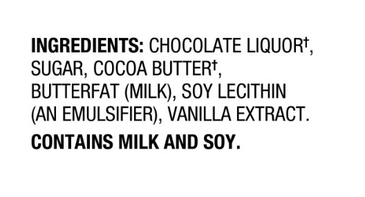 INGREDIENTS CHOCOLATE LIQUOR, SUGAR, COCOA BUTTER, BUTTERFAT (MILK), SOY LECITHIN (AN EMULSIFIER), VANILLA EXTRACT. Contains Milk and Soy