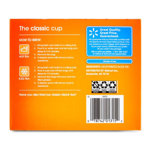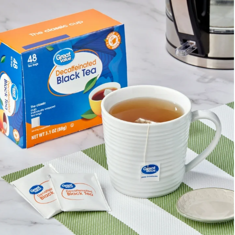Enjoy the soothing aroma and vibrant flavor of tea -- even close to bedtime -- with Great Value Decaffeinated Black Tea Bags. Steep in hot water and serve with lemon for a classic and satisfying combination that you can enjoy morning, noon, or night. Try this black tea over ice during warmer times of the year when you need a refreshing, sugar-free drink. Each container of Great Value Decaffeinated Black Tea Bags comes with 50 bags so you can stay well-stocked both at home and at the office.
