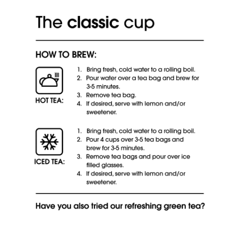 Hot Tea Instructions: **1. Bring fresh cold water to a rolling boil. **2. Pour water over a tea bag and brew for 3 to 5 minutes. **3. Remove tea bag. **If desired, serve with lemon and/or sweetener. **Iced Tea Instructions: **1. Bring fresh cold water to a rolling boil. **2. Pour 4 cups over 3 to 5 tea bags and brew for 3 to 5 minutes. **3. Remove tea bags and pour over ice filled glasses. **If desired, serve with lemon and/or sweetener.