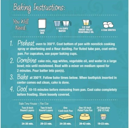 BAKING INSTRUCTIONS: 1- Preheat oven to 350 degrees. Coat bottom of pan with nonstick cooking spray or shortening and a flour dusting. For fluted tube pan, coat entire pan. For cupcakes, use paper baking cups. 2- Combine cake mix, egg whites, vegetable oil, and water in a large bowl; mix until moistened. Beat with a mixer on medium speed for 2 minutes. :Pour batter in to pan(s). 3- Bake at 350 degrees. Follow bake times below. Whe toothpick inserted in the center comes out clean, cake is done. 4- Cool 10-15 minutes before removing from pan. Cool cake completely before frosting. Store loosely covered.