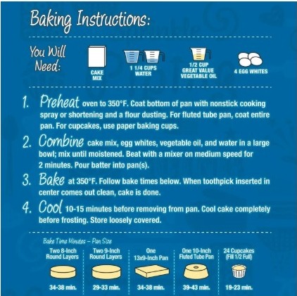1. Preheat oven to 350 degrees. Coat bottom of pan with nonstick cooking spray or shortening and a flour dusting. For Fluted Tube Pan, coat entire pan. For cupcakes, use paper baking cups. 2. Combine cake mix, egg whites, vegetable oil, and water in a large bowl; mix until moistened. Beat with a mixer on medium speed for 2 minutes. Pour batter into pan(s). 3. Bake at 350 degrees. Follow bake times below. When toothpick inserted in the center comes out clean, cake is done. 4. Cool 10-15 minutes before removing from pan. Cool cake completely before frosting. Store loosely covered.