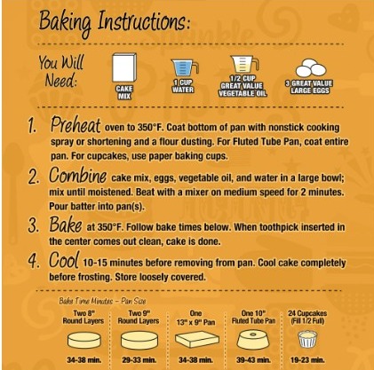 BAKING INSTRUCTIONS: 1- Preheat oven to 350 degrees. Coat bottom of pan with nonstick cooking spray or shortening and a flour dusting. For fluted tube pan, coat entire pan. For cupcakes, use paper baking cups. 2- Combine cake mix, eggs, vegetable oil, and water in a large bowl; mix until moistened. Beat with a mixer on medium speed for 2 minutes. :Pour batter in to pan(s). 3- Bake at 350 degrees. Follow bake times below. Whe toothpick inserted in the center comes out clean, cake is done. 4- Cool 10-15 minutes before removing from pan. Cool cake completely before frosting. Store loosely covered.