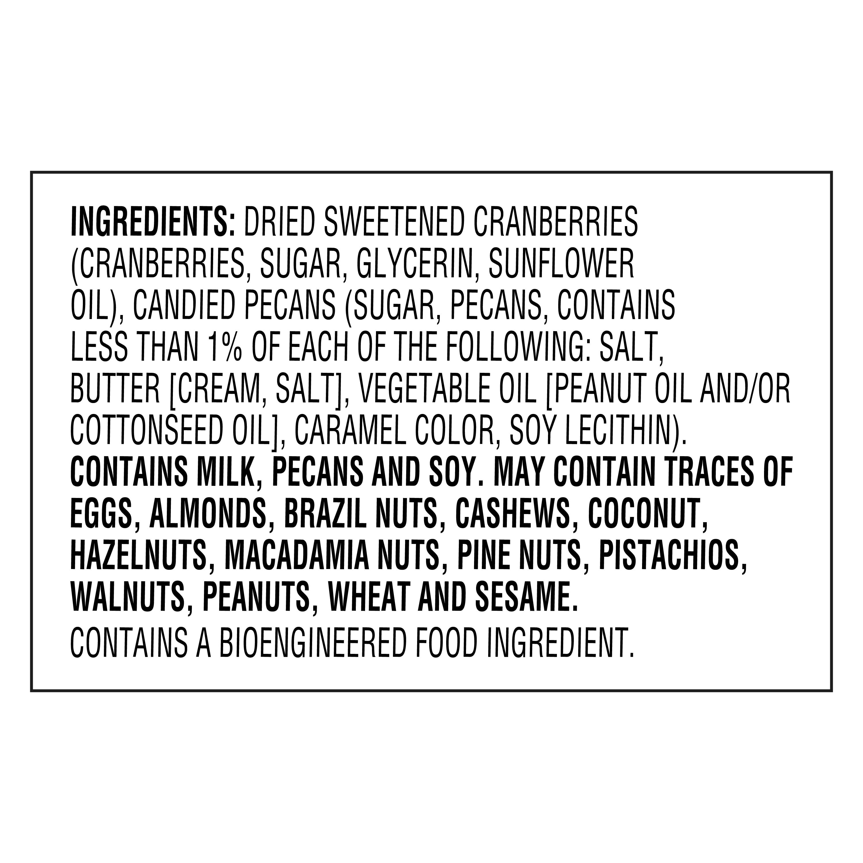 Dried Sweetened Cranberries (Cranberries, Sugar, Glycerin, Citric Acid, Sunflower Oil), Candied Pecans (Pecans, Sugar, contains less than 1% of the following: Butter [Cream, Salt], Salt, Peanut and/or Cottonseed Oil, Soy Lecithin, Caramel Color).