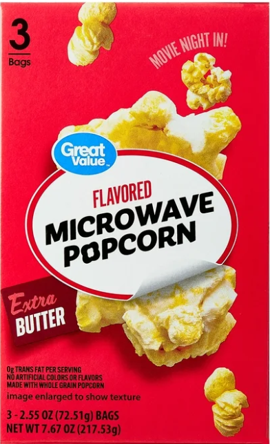 - Great Value Extra Butter Flavored Microwave Popcorn, 2.55 oz, 3 Count