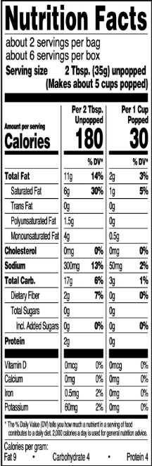 POPCORN, PALM OIL, SALT, NATURAL FLAVORS, ROSEMARY EXTRACT (TO PRESERVE FRESHNESS), COLOR ADDED, ASCORBIC ACID (TO PRESERVE FRESHNESS), BUTTER (CREAM, SALT). CONTAINS MILK.