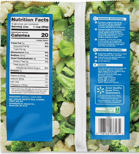 - Great Value Broccoli & Cauliflower, 12 oz (Frozen)