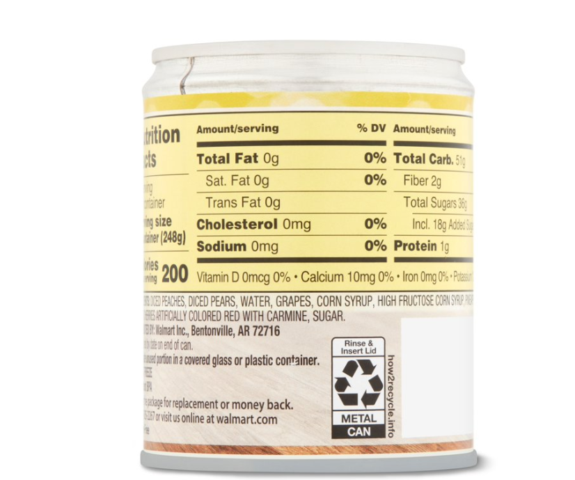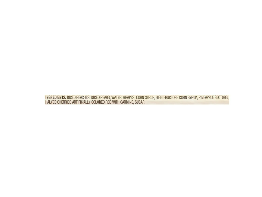 Diced Peaches, Diced Pears, Water, Grapes, Corn Syrup, High Fructose Corn Syrup, Pineapple Sectors, Halved Cherries Artificially Colored Red with Carmine, Sugar