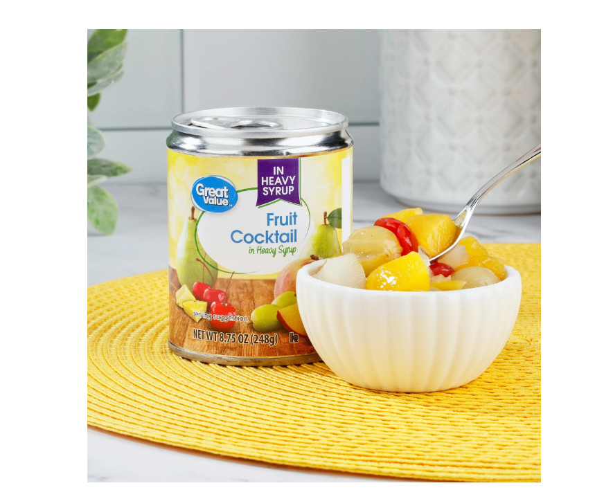 Enjoy a smart snack with an assortment of popular fruits with this Great Value Fruit Cocktail in Heavy Syrup. It contains peaches, pears, grapes, pineapple sectors and halved cherries in a thick syrup. Tender and sweet, these different fruits provide you with many essential nutrients you need every day, along with a medley of different flavors. The pre-cut fruits also make it a convenient option for snacking. Create something everyone will enjoy with Great Value Fruit Cocktail in Heavy Syrup.