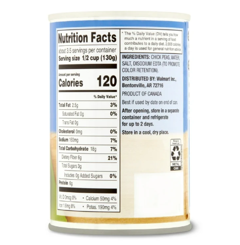 Great Value Garbanzos Chick Peas are a delicious way to expand your home cooking repertoire. These chick peas pack as much flavor as they do nutrition, with 4 grams of dietary fiber and 6 grams of protein per serving and are naturally low in fat. Blend these chick peas with lemon juice, tahini, garlic, olive oil, and cumin to make fresh hummus that will easily outshine any store-bought varieties. Cool them after cooking and brown them in a pan with salt, pepper, paprika, and chili powder for a crispy, toasty snack. Add great taste and nutrition to your meals with Great Value Garbanzos Chick Peas.