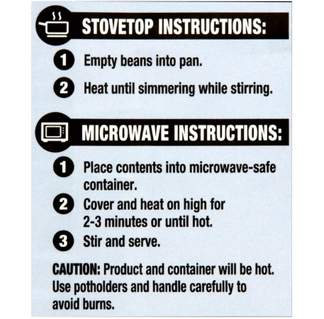Cooking Instructions - General **Caution: Product and container will be hot. **Use potholders and handle carefully to avoid burns. **Stovetop - From Ambient **1. Empty beans into pan. **2. Heat until simmering while stirring. **Microwave - From Ambient **1. Place contents into microwave-safe container. **2. Cover and heat on high for 2-3 minutes or until hot. **3. Stir and serve.