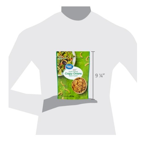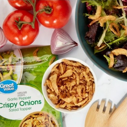 Elevate your next salad with ease by tossing in some Great Value Garlic Pepper Crispy Onions Salad Topper. These crispy onions provide a savory aroma, mildly spicy flavor, and a delightful crunch to any meal. Try adding them to your burger, sandwich, or stuffing for added texture and a more complex flavor. Crush them and combine with breadcrumbs for a breading that will enhance the flavor of any chicken dish. Combine them with ricotta and stuff into pasta shells for a dinner that will have your family asking for seconds. Great Value Garlic Pepper Crispy Onions Salad Topper are a quick and easy way to bring more flavor to any meal!