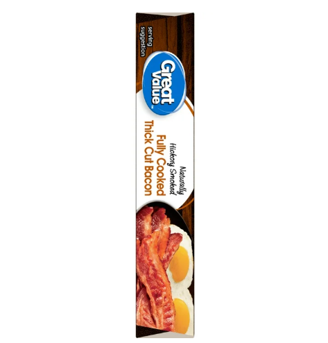 Great Value Thick Cut Naturally Hickory Smoked Fully Cooked Bacon is fully cured and naturally hickory smoked for rich, savory flavor. With 6 grams of protein per serving, three fried slices (18g), this thick cut pork bacon adds delicious flavor to pastas, club sandwiches, and grilled hamburgers. If you love Applewood smoked bacon flavor, then you're sure to love this hickory smoked bacon meat that is sliced and ready to heat and serve. For a savory breakfast, heat and serve it with eggs and toast. Includes one 2.1 oz package of fully cooked, thick cut, hickory smoked bacon. Sealed in a plastic vacuum-packed container for ultimate freshness. For safe handling, keep refrigerated or frozen until ready to consume.