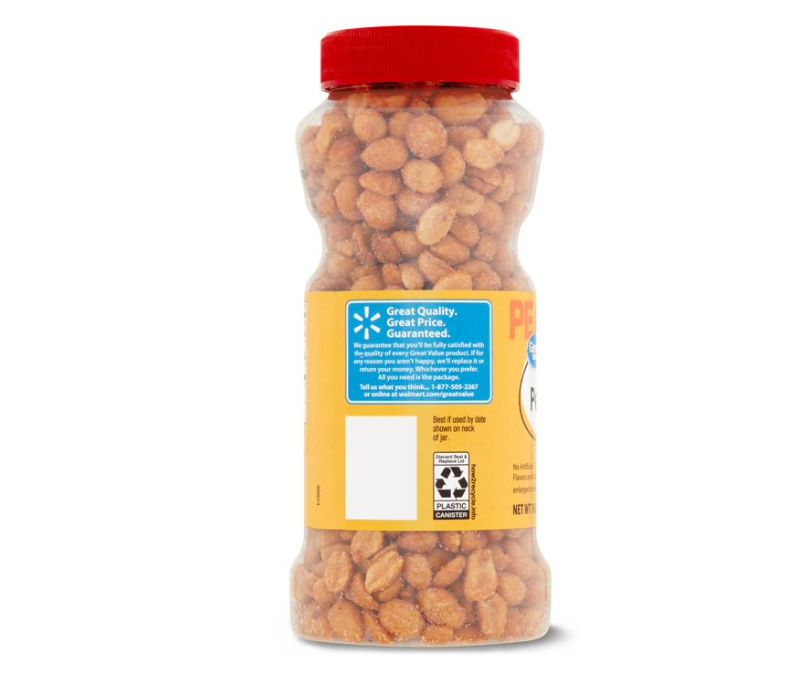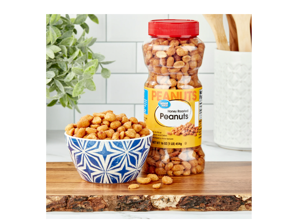 Grab Great Value Honey Roasted Peanuts for a delicious snack that the whole family can enjoy. A good source of 3 vitamins and minerals and low in carbohydrates, our honey roasted peanuts are also low in sodium, ideal for people watching their salt intake. Honey roasted for that classic sweet peanut flavor, these peanuts can be used to enhance a variety of meals. Add crunch and protein to salads, make homemade trail mix by adding raisins and chocolate, or add as a topping to an ice cream sundae bar. Make your own homemade sweet and chunky peanut butter as an after-school project with kids. What's more, Great Value Dry Roasted Honey Roasted Peanuts come with an easy screw top lid, making them a convenient choice for the family on-the-go. Great Value products provide families with affordable, high quality grocery and household consumable options. With our wide range of product categories spanning grocery and household consumables, we offer you a variety of products for your family's needs.
