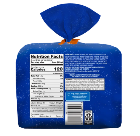 Ingredients: Enriched Wheat Flour (Flour, Malted Barley Flour, Reduced Iron, Niacin, Thiamine Mononitrate [Vitamin B1], Riboflavin [Vitamin B2], Folic Acid), Water, Sugar, Yeast, Soybean Oil, Wheat Gluten, Salt, Monoglycerides, Calcium Propionate (Preservative), Datem, Grain Vinegar, Citric Acid, Calcium Sulfate, Potassium Iodate, Monocalcium Phosphate, Soy Lecithin.