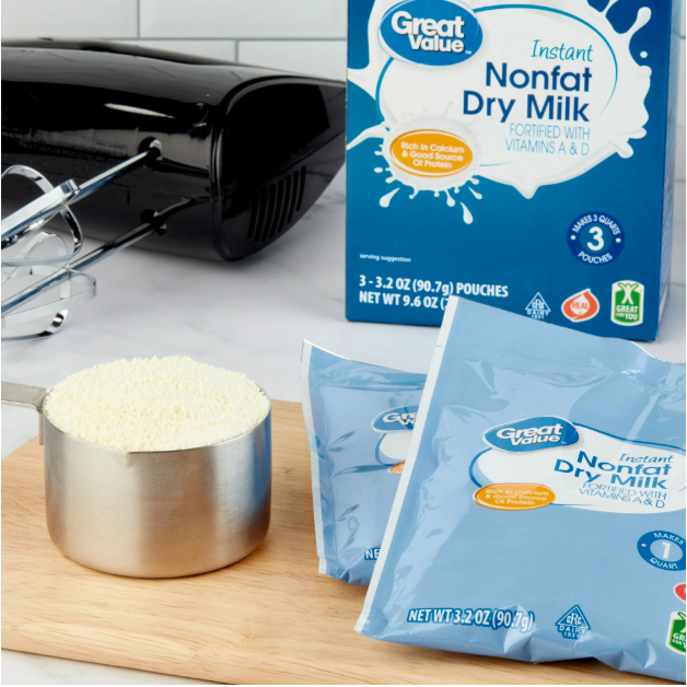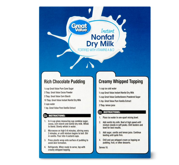 Great Value Instant Nonfat Dry Milk is a convenient and nutritious alternative to liquid milk. Our dry milk is fortified with vitamins A and D, it is rich in calcium, and a good source of protein. Each box contains 3 individual 3.2 oz pouches (makes 3 quarts total, 12 servings per container). Great Value Instant Nonfat Dry Milk is easy to store and has a long shelf life. Keep it on hand to make a fresh glass of milk, use in recipes, or to prepare for emergencies. Our dry milk adds nutrients and a creamy texture to your favorite recipes, without adding the fat. It’s great in smoothies, coffees, baked goods, savory dishes, and makes a delicious non-fat thick chocolate pudding and a creamy whipped topping. Great Value Instant Nonfat Dry Milk goes from farm to your table as a fresh glass of milk or a nutritious addition to all your cooking and baking.