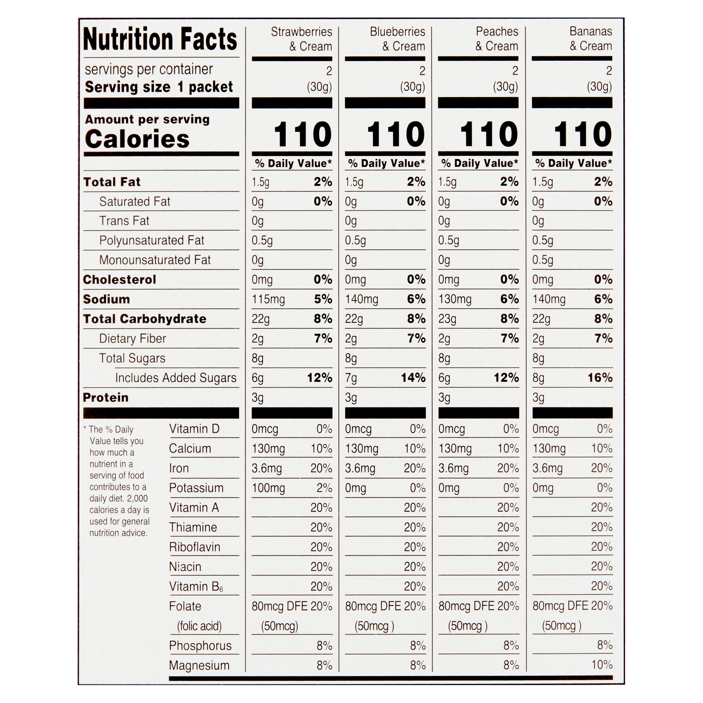 Great Value Instant Fruit and Cream Oatmeal Variety Pack. Enjoy a different flavor of fruity, creamy instant oatmeal every day with Great Value Fruit and Cream Flavor Variety Pack Instant Oatmeal. A nutrient-dense food that delivers a thick and creamy texture when prepared, this variety pack comes with all your favorite flavors including strawberries and cream, blueberries and cream, peaches and cream, and bananas and cream. This heart-healthy oatmeal is the perfect quick and tasty option for your morning meals. Serve it with scrambled eggs, crispy bacon, and buttered toast for a filling breakfast. This box comes with 10 packets, making it easy to stock up on your favorite oatmeal. Just add water and heat for two minutes to enjoy great-tasting oatmeal.