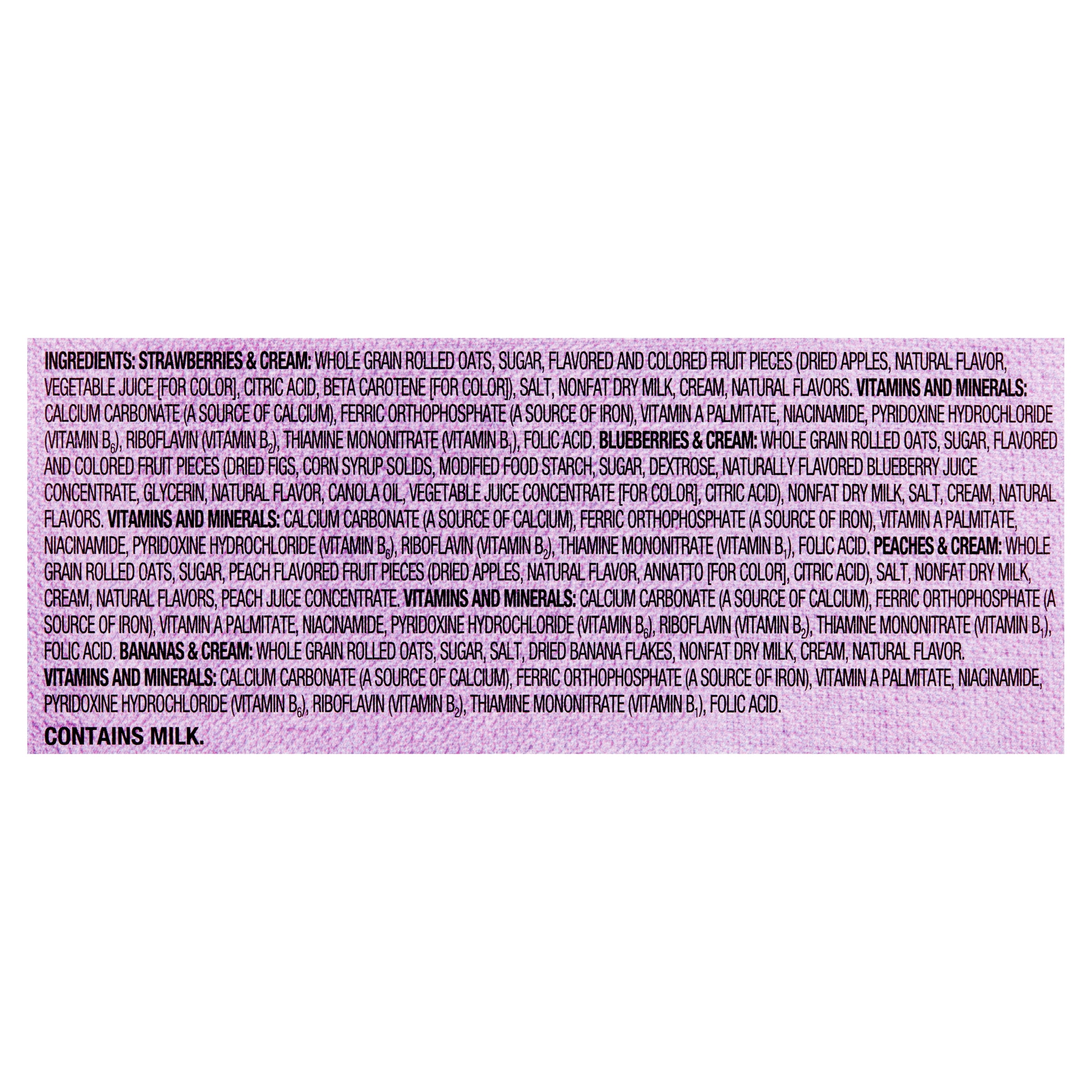 BLUEBERRIES & CREAM: WHOLE GRAIN ROLLED OATS, SUGAR, FLAVORED AND COLORED FRUIT PIECES (DRIED FIGS, CORN SYRUP SOLIDS, MODIFIED FOOD STARCH, SUGAR, DEXTROSE, NATURALLY FLAVORED BLUEBERRY JUICE CONCENTRATE, GLYCERIN, NATURAL FLAVOR, CANOLA OIL, VEGETABLE JUICE CONCENTRATE [FOR COLOR], CITRIC ACID), NONFAT DRY MILK, SALT, CREAM, NATURAL FLAVORS.