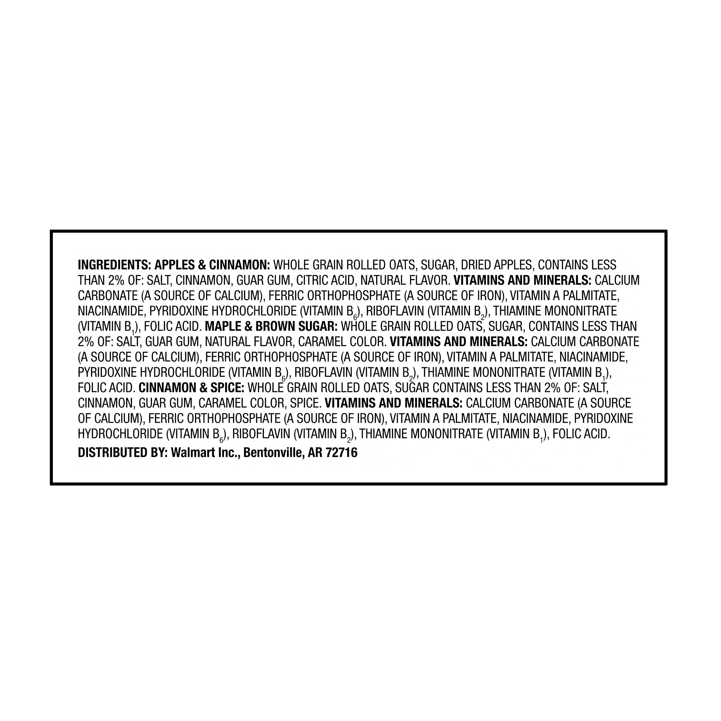 The Great Value Instant Oatmeal Variety Pack is filled with delicious flavor and seven essential vitamins and minerals to keep you healthy and full of energy. Each box contains two packets of original, apples and cinnamon, maple and brown sugar, cinnamon and spice, and raisin and spice oatmeal, so you're sure to please everyone in your household. Start each day with a heart-healthy breakfast containing protein and dietary fiber that can be easily cooked in one to two minutes, either in the microwave or by simply adding boiling water. Serve it warm or chill it in the fridge for quick overnight oats on busy mornings. No matter how you enjoy it, you can be sure you're making a healthy choice when you choose the Great Value Instant Oatmeal Variety Pack.