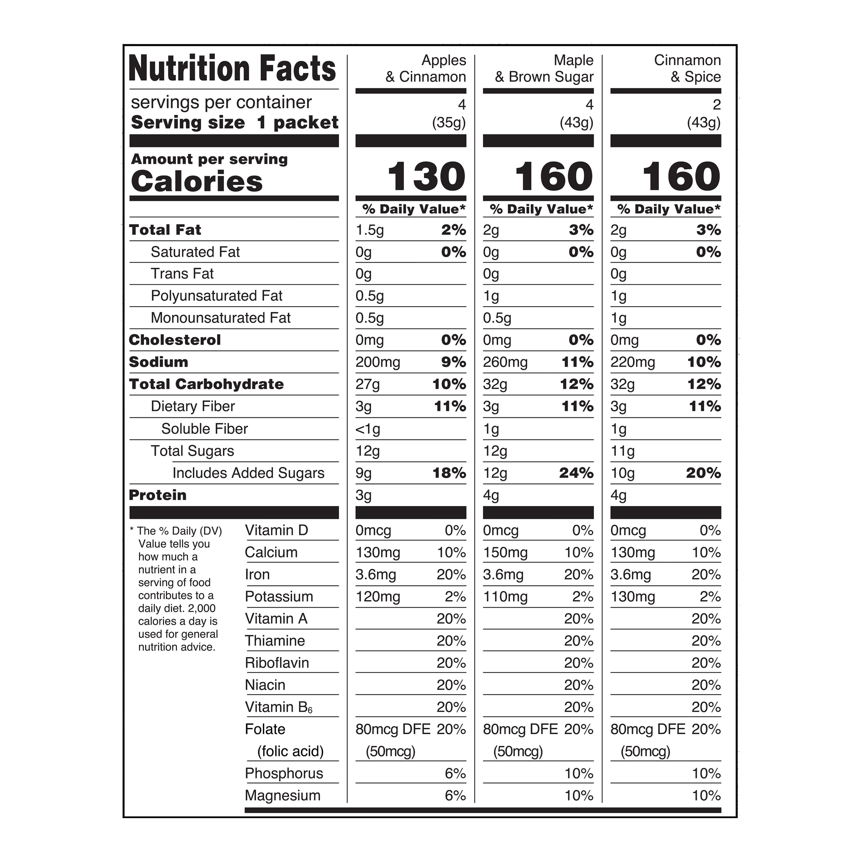 Maple & Brown Sugar: Whole Grain Rolled Oats, Sugar, Contains less than 2% of: Salt, Calcium Carbonate (a source of Calcium), Guar Gum, Oat Flour (Whole), Caramel Color, Ferric Phosphate (a source of Iron), Natural & Artificial Flavor, Vitamin A Palmitate, Niacinamide, Pyridoxine Hydrochloride (Vitamin B₆), Riboflavin, Thiamine Mononitrate*, Folic Acid*. One of the B Vitamins.
